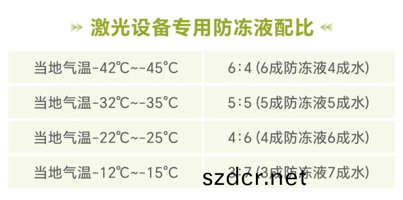♢ 极寒天气情况下,请严格按照防冻液配比及时添加激光设备专用防冻液,配比参考如下表;